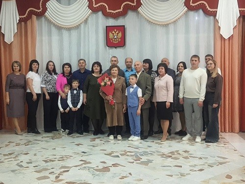 К поздравлениям присоединилась начальник отдела ЗАГС Борского района М.П. Подвигина. Она вручила поздравительный адрес от губернатора Самарской области супругам Валерию и Клавдии Потаповым. В этом году пара отметила пятьдесят пять лет семейной жизни. Они - счастливые родители трех сыновей, а также бабушка и дедушка шестерых внуков. В этом году в их семье родилась первая правнучка. Их семейная жизнь строится на крепких узах доверия и любви.